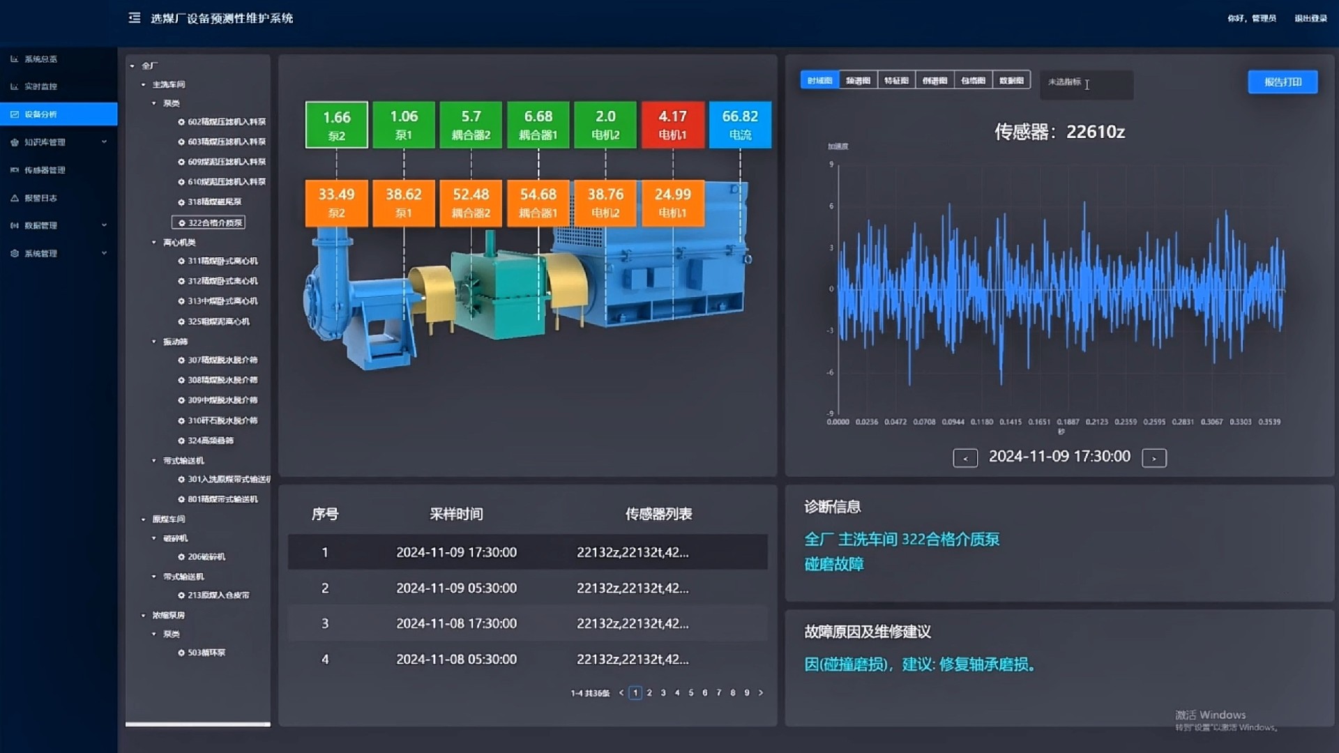 產(chǎn)品簡介:選煤廠設(shè)備預(yù)測性維護(hù)系統(tǒng)實時采集選煤廠生產(chǎn)設(shè)備的多維數(shù)據(jù)(溫振數(shù)據(jù)、電氣數(shù)據(jù)、設(shè)備實時數(shù)據(jù)、設(shè)備管理數(shù)據(jù)、音視頻數(shù)據(jù)),利用先進(jìn)數(shù)字信號處理算法、人工智能算法、專家知識庫等方法對設(shè)備進(jìn)行實時監(jiān)測、故障分析和故障溯源。在設(shè)備出現(xiàn)異常時,能夠分析出異常原因,給出合理維修建議,生成維修報告并白動推送給檢修人員,指導(dǎo)檢修人員進(jìn)行設(shè)備維護(hù),實現(xiàn)流程化閉環(huán)管理。選煤廠設(shè)備預(yù)測性維護(hù)系統(tǒng)可早期發(fā)現(xiàn)設(shè)備異常,實現(xiàn)由“事后維修”向“預(yù)知檢修”的轉(zhuǎn)變,從而實現(xiàn)設(shè)備維護(hù)安全損失最小、總維護(hù)成本最低、總維修時間最少。