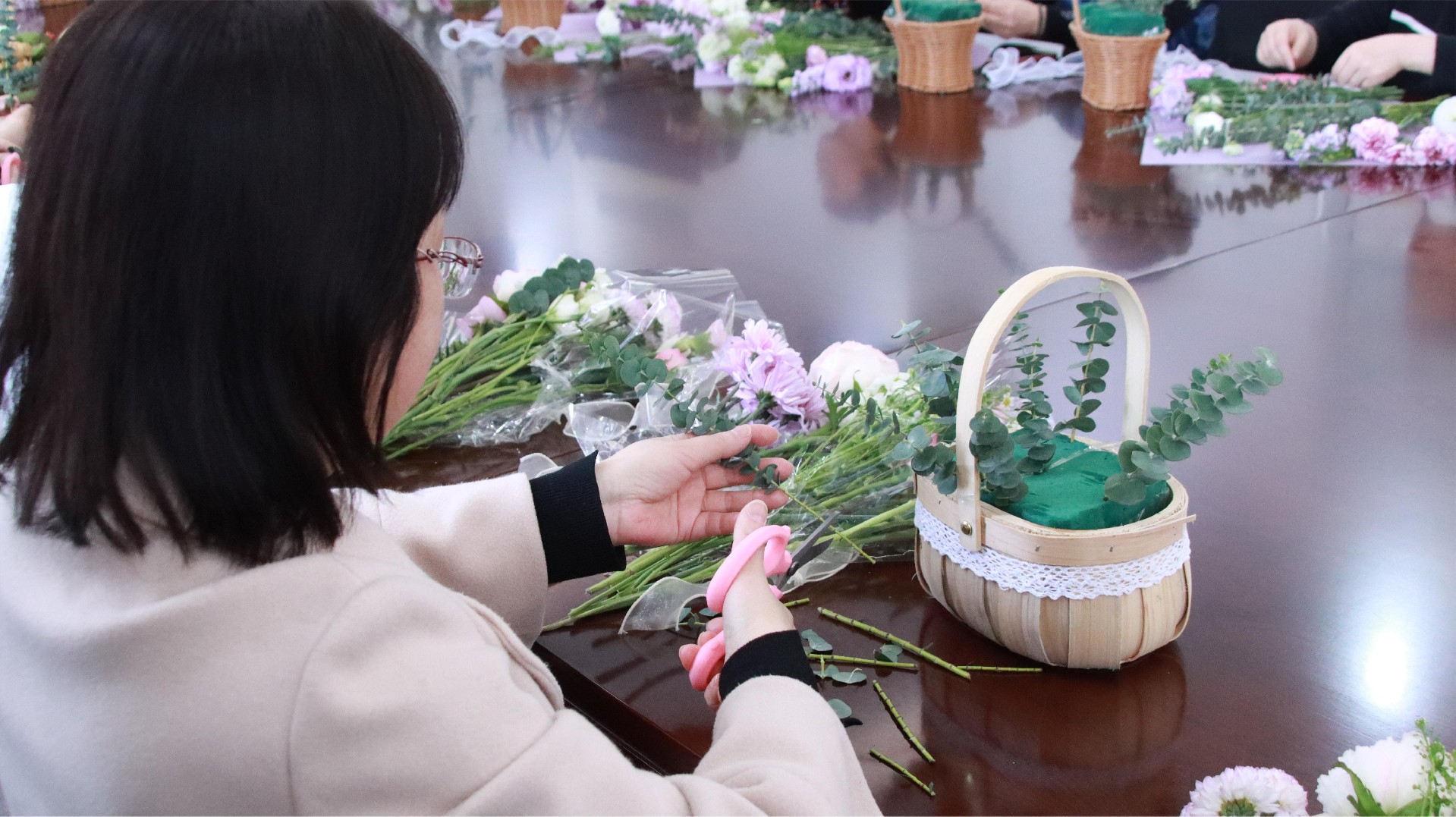 活動邀請專業(yè)花藝師給大家講授插花知識,講師從花材選擇、養(yǎng)護技巧、花籃造型、花型搭配等方面,向在場“女神們”詳細介紹了插花藝術(shù)的要素與技巧。